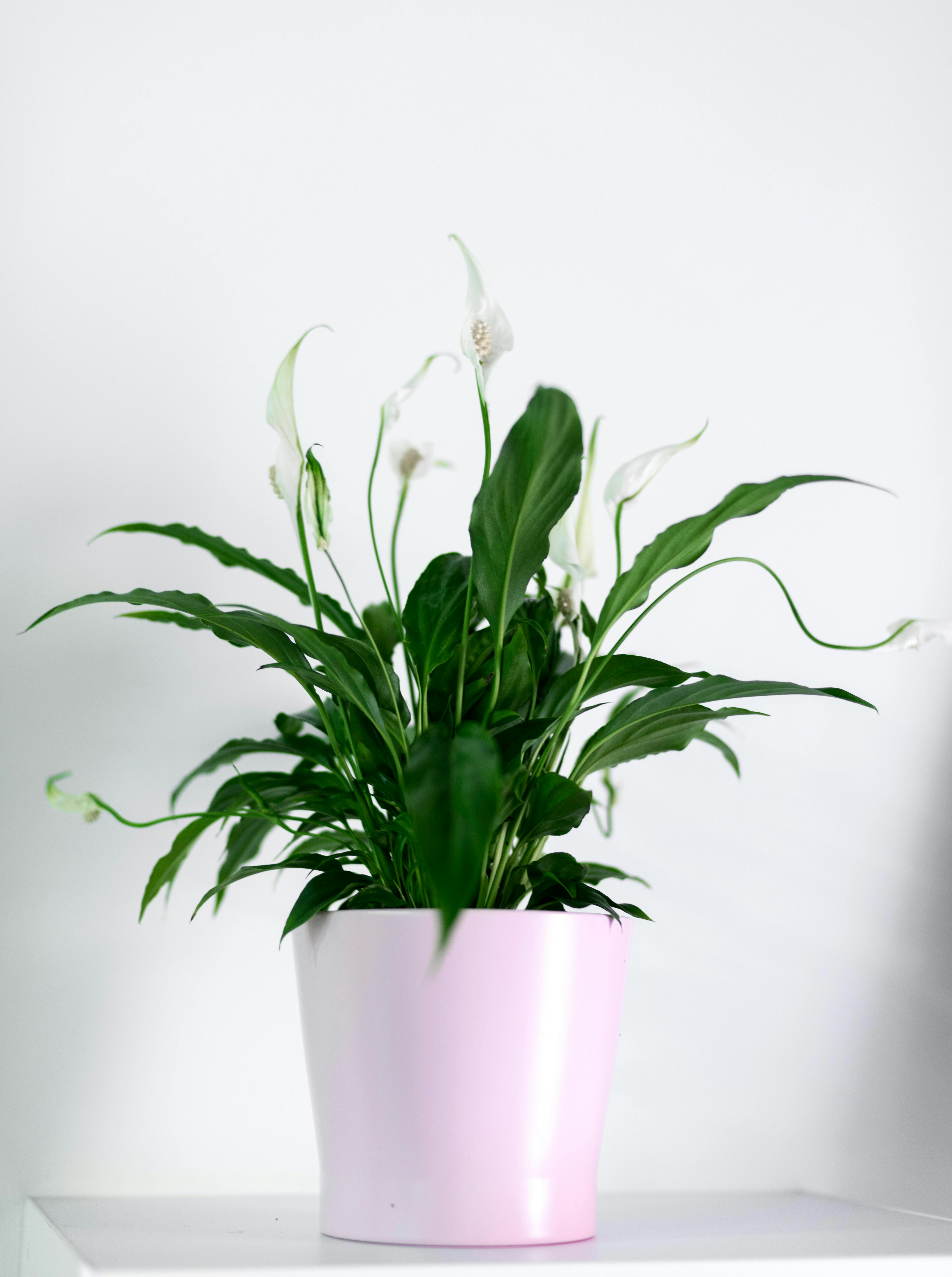 넓은 잎과 하얀 꽃이 매력적인 스파티필름은 포름알데히드, 벤젠 등 유해 물질 제거에 효과적입니다. 증산작용이 활발해 실내 습도 조절에도 도움이 됩니다.